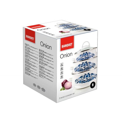 6dílná sada smaltovaného nádobí ONION obsahuje 3 hrnce se skleněnými poklicemi: objem 0,9 l (průměr 16 cm, výška 7,4 cm), objem 1,3 l (průměr 18 cm, výška 8,3 cm), objem 1,9 l (průměr 20 cm, výška 8,9 cm). Hrnce lze používat na všechny typy varných desek mimo indukce.