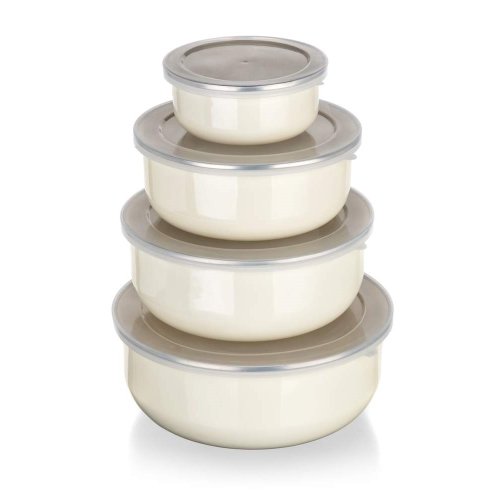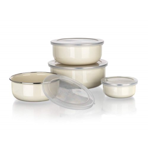 8dílná sada smaltovaných misek AMANDE s plastovými víčky o průměrů 10, 14, 16 a 18 cm. Misky jsou určeny pouze pro uchovávání potravin, nejsou určeny na vaření.