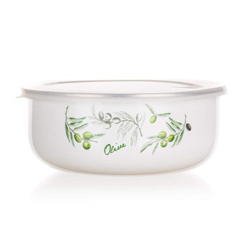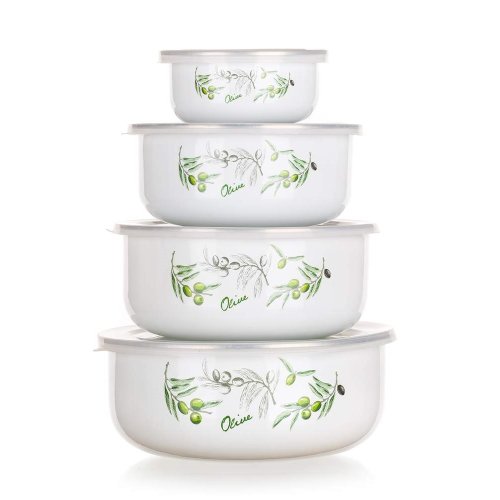 8dílná sada smaltovaných misek OLIVES s plastovými víky, průměry: 10, 14, 16 a 18 cm. Misky jsou určeny pouze pro uchovávání potravin, nejsou určeny na vaření.