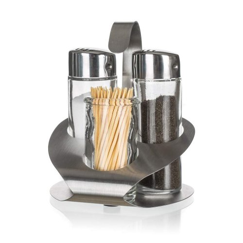 Sada solnička a pepřenka CULINARIA 35 ml, 4 ks. Víko: nerez 18/8 a plast PP a silikonové těsnění, síla nerezy 0,40 mm, dózy: sklo, stojan nerez 18/0, základna: 0,60 mm, držadlo 0,80mm.
