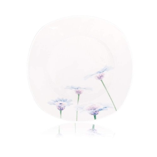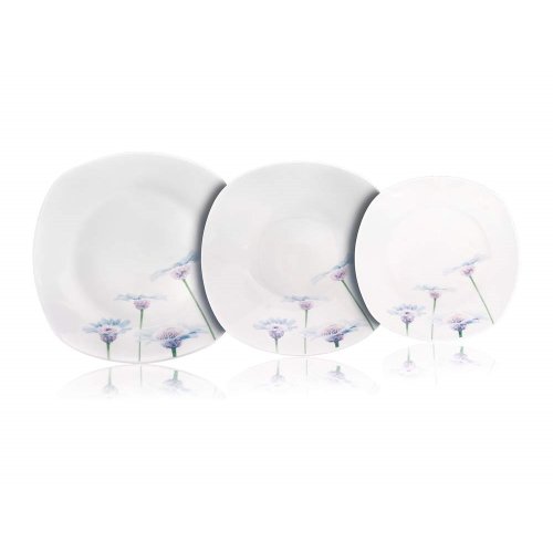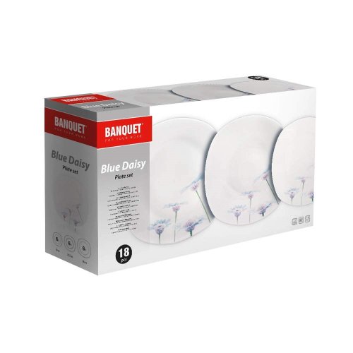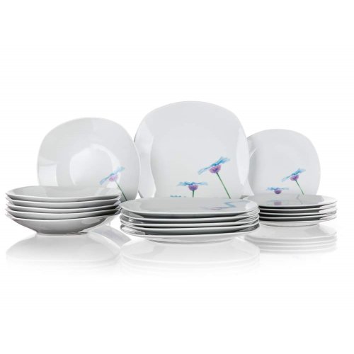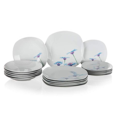 18dílná talířová sada square v bílé barvě s dekorem BLUE DAISY je vyrobena z porcelánu, vhodná k servírování různých pokrmů. Sada obsahuje: 6 x dezertní talíř (diagonála 20 cm, šířka 18,5 cm), 6 x hluboký talíř (diagonála 23 cm, šířka 22 cm) a 6 x mělký talíř (diagonála 27 cm, šířka 25 cm). Talíře lze používat do mikrovlnné trouby a mýt v myčce na nádobí.