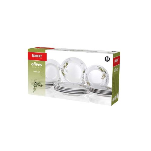 18dílná talířová sada OLIVES s dekorem olivy se skládá ze 6 ks hlubokých talířů 21,5 cm, 6 ks mělkých talířů 24 cm a 6 ks dezertních talířů 19 cm. Sada je vyrobena z porcelánu, je vhodná do myčky a mikrovlnné trouby.