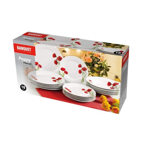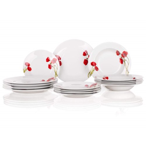 18dílná talířová sada POPPY, sada obsahuje: 6x dezertní talíř 19 cm, 6x hluboký talíř 21,5 cm, 6x mělký talíř 24 cm, materiál - porcelán. Talíře lze používat do mikrovlnné trouby a mýt v myčce na nádobí.