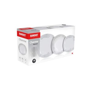 18dílná talířová sada square CHARME je vyrobena z porcelánu. Sada obsahuje 6x dezertní talíř (diagonála 20 cm, šířka 18,5 cm), 6x hluboký talíř (diagonála 23 cm, šířka 22 cm) a 6x mělký talíř (diagonála 27 cm, šířka 25 cm). Talíře lze používat do mikrovlnné trouby a mýt v myčce na nádobí.