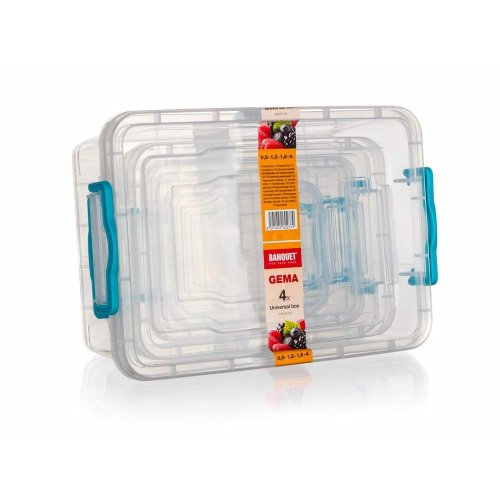 Sada čtyř plastových multifunkčních boxů GEMA o objemu 0,5 l (16 x 11 x 6 cm), 1,2 l (20,5 x 13,5 x 7 cm), 1,8 l (25,5 x 16,5 x 7,5 cm) a 4 l (30,5 x 20 x 10,5 cm) s tyrkysovými madly je vhodná nejen pro ukládání předmětů, ale i jejich přepravu.