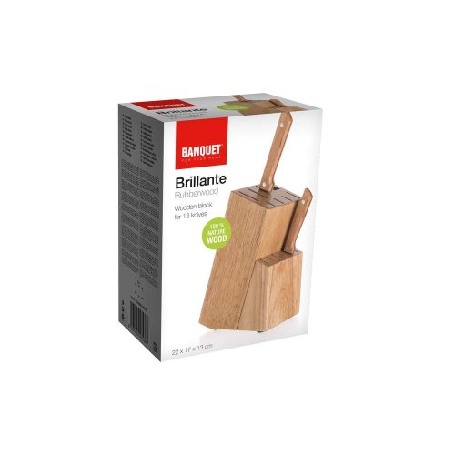 Dřevěný blok na 13 nožů a nůžky Brillante o rozměru 22 x 17 x 13 cm najde praktické využití ve Vaší kuchyni. Blok je vyrobený z tropického gumovníkového dřeva a je opatřen protiskluzovými nožkami.