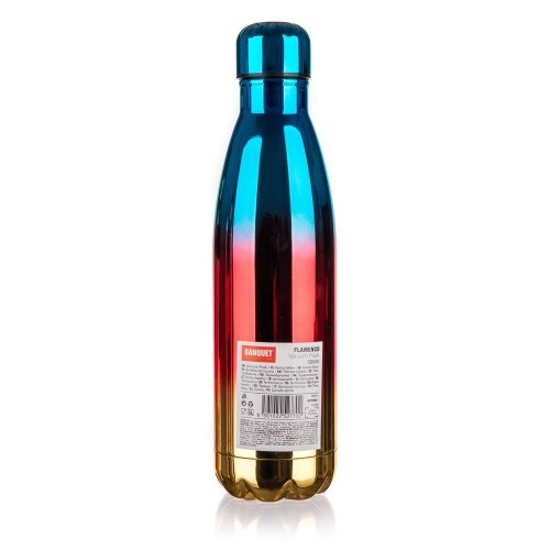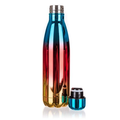 Termo láhev FLAMENCO o objemu 500 ml má vnější i vnitřní povrch z nerezi a plastové víčko. Díky dvoustěnnému provedení si udrží nápoj déle svou teplotu. Termo láhev je ve velmi efektivním, duhovém, lesklém provedení.
