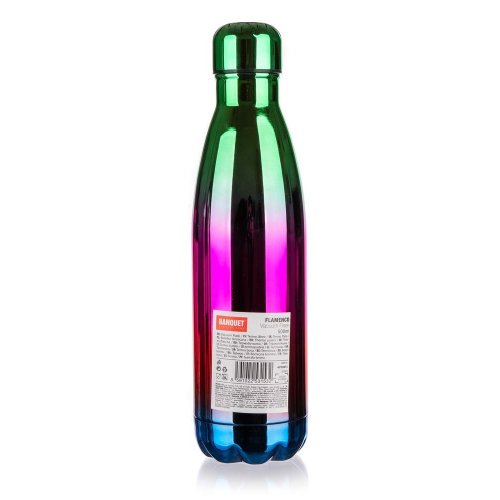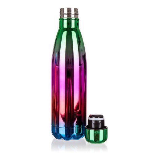 Termo láhev FLAMENCO o objemu 500 ml má vnější i vnitřní povrch z nerezi a plastové víčko. Díky dvoustěnnému provedení si udrží nápoj déle svou teplotu. Termo láhev je ve velmi efektivním, duhovém, lesklém provedení.