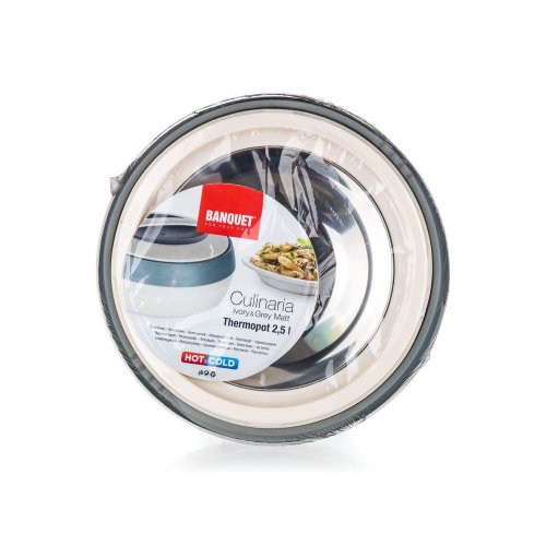 Termohrnec s poklicí COSMOS 2,5 l v barvě ivory-šedá, je praktický pro uchovávání teplých pokrmů. Ocení ho hlavně kuchaři a kuchařky při uskladnění hotových pokrmů před samotným servírováním. Termohrnec se vyrábí v několika velikostech. Vnitřek hrnce tvoří nerezová vložka, výplň mezi stěnami je z PUR pěny pro zachování vynikající izolace při skladování či přenášení potravin.
