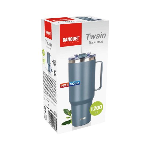 Dvoustěnný cestovní termohrnek TWAIN v tmavě šedé barvě, je vhodný na teplé i studené nápoje. Vnější část je vyrobena z nerezu 201, vnitřní část z nerezu 304 a víčko z plastu. Využitelný objem je 1200 ml. Tělo hrnku je vakuové, udrží tak nápoje déle horké či studené. Víčko není nepropustné, doporučujeme uchovávat ve svislé poloze. Součástí balení je PP brčko a kartáček na čištění brčka.