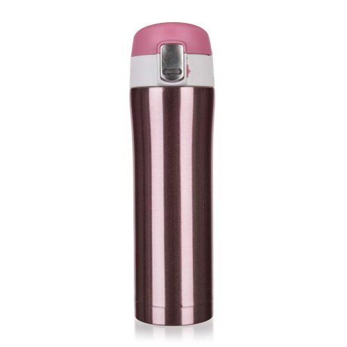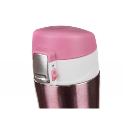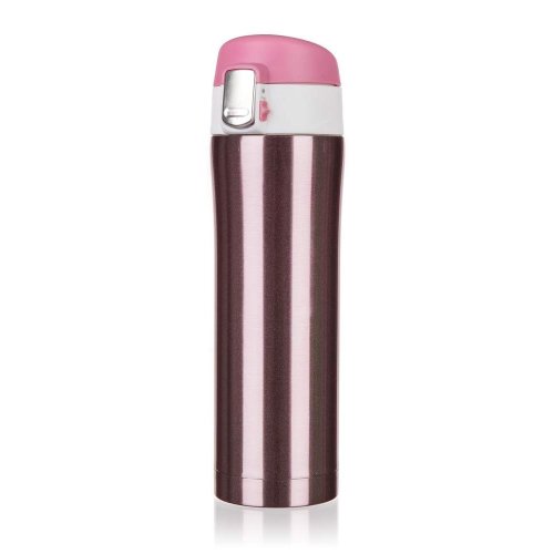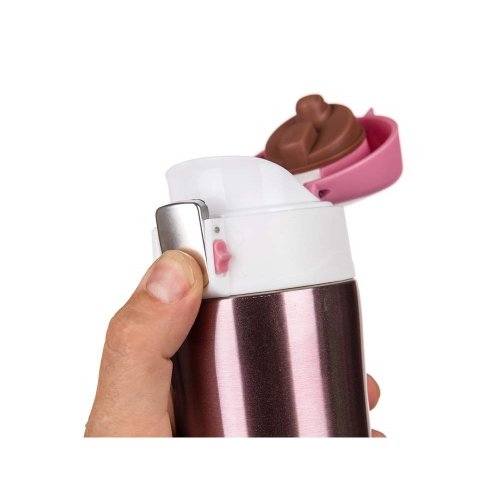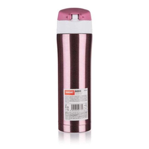 Cestovní termoska BODO o objemu 430 ml má vnější i vnitřní povrch z nerezi a plastové vyklápěcí víčko. Díky dvoustěnnému provedení si udrží nápoj déle svou teplotu. Víčko se otevírá stisknutím pojistky, u které je zámek zabraňující nechtěnému otevření termosky.