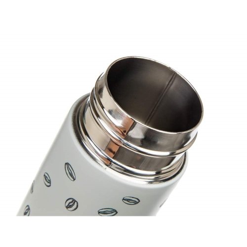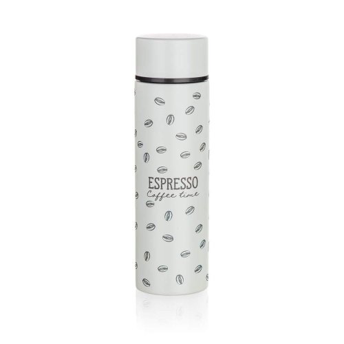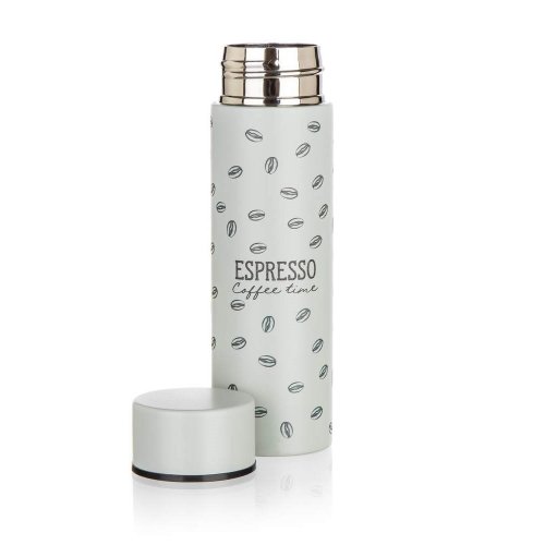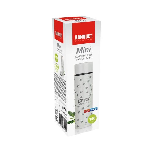 Nerezová cestovní termoska MINI o objemu 140 ml v šedé barvě s dekorem kávových zrn, má dvouplášťové provedení, díky kterému udrží nápoj déle svou teplotu. Vnější i vnitřní povrch je vyroben z nerezu a plastové víčko. V MINI termosce si můžete svou oblíbenou kávu vzít kamkoli s sebou. Díky své velikosti se termoska pohodlně vejde do kabelky, nebo i kapsy.