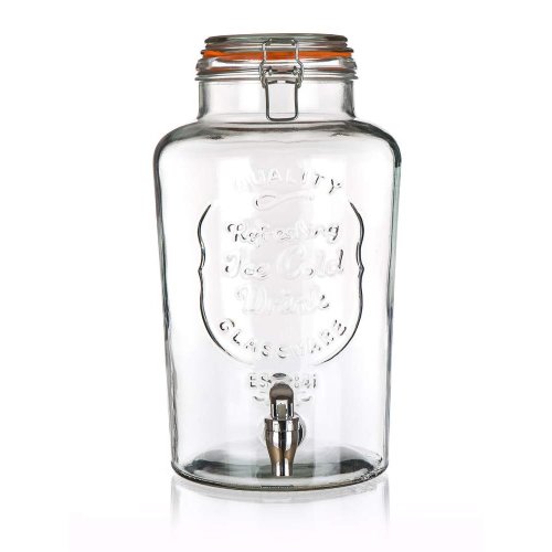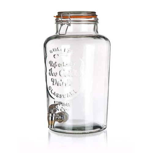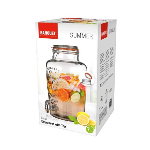Skleněný zásobník na nápoje SUMMER o objemu 7 l slouží k servírování osvěžujících nápojů na oslavách a letních párty. Zásobník je vyroben z kvalitního čirého skla a je opatřen praktickým plastovým kohoutkem pro dávkování nápojů. Zásobník je určený k podávání pouze chladných a svěžích letních nápojů typu domácí limonáda, ovocný džus, ledový čaj a podobně. Široké hrdlo umožňuje do nádoby pohodlně vkládat led nebo kousky ovoce. Hloubka výrobku je včetně ventilu. V balení 2 ks těsnění.