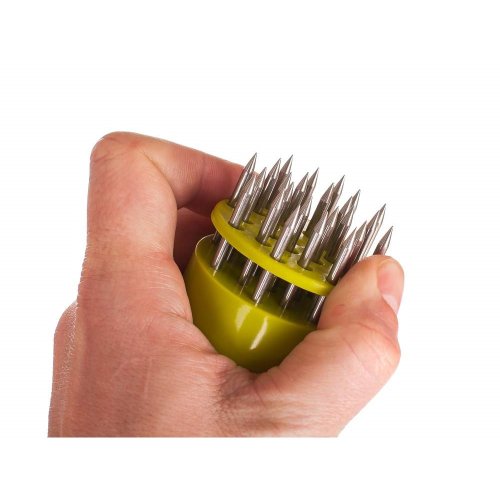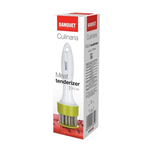 Změkčovač masa CULINARIA má ostré nože, které prořezávají a zkracují vlákna, maso tak zůstává jemné, křehké a plné šťávy. Celková délka je 19 cm, rukojeť - plast, nerezové jehly. Tenderizer je vhodný na všechny druhy červeného masa. Pomocník pro opravdové gurmány, nerezové jehly provzdušní maso, které se tak lépe propeče. Ostré jehly nařežou a zkrátí vlákna masa a díky této úpravě je maso křehké, šťavnaté a měkké.