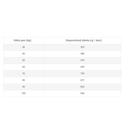Analytické složky: hrubý protein 24 %, hrubý tuk 14 %, omega 3 mastné kyseliny 0,30 %, omega 6 mastné kyseliny 3 %, hrubá vláknina 3 %, hrubý popel 8,50 %, vápník 1,70 %, fosfor 1,20 %.
