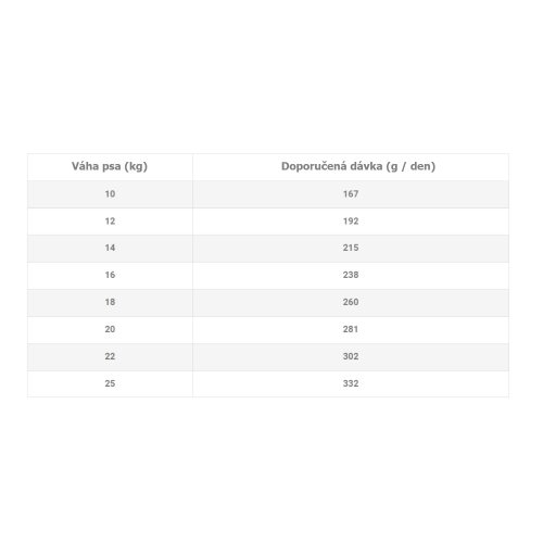 Analytické složky: hrubý protein 25 %, hrubý tuk 15 %, omega 3 mastné kyseliny 0,30 %, omega 6 mastné kyseliny 3 %, hrubá vláknina 2,75 %, hrubý popel 8,50 %, vápník 1,75 %, fosfor 1,20 %.