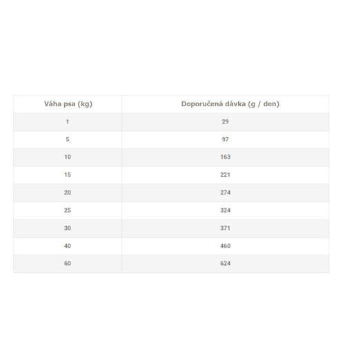 Analytické složky: hrubý protein 28 %, hrubý tuk 17 %, omega 3 mastné kyseliny 0,50 %, omega 6 mastné kyseliny 3 %, hrubá vláknina 3,50 %, hrubý popel 7 %, vápník 1,40 %, fosfor 0,95 %.