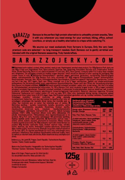 Objevte jedinečný zážitek delikátního sušeného vepřového masa Barazzo! Ručně vybírané prvotřídní kousky vepřového masa, mistrovsky ochucené originální směsí koření Barazzo, nabízí nejen vysoký obsah bílkovin, ale i neuvěřitelnou křehkost, která překonává tradiční sušené hovězí. Nechte se unést jedinečnou chutí a jemností každého kousku, pečlivě vysušeného na vzduchu pro dokonalý zážitek.