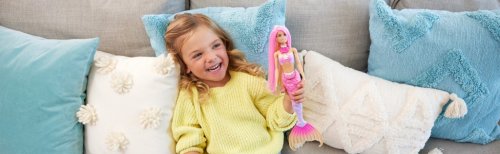 Tato panenka Barbie® mořská panna inspirovaná filmem Barbie® a dotek kouzla dodává hrám kouzlo díky možnosti proměny barev! Jako by ji očarovala podmořská magie, její super dlouhé vlasy, tvarovaný živůtek a ombre ocas mění barvy z růžové jako žvýkačka na tmavě fialovou. Je navržena s krásnými detaily od hlavy až k patě a patří k ní také stylingové doplňky, kartáč a roztomilý mazlíček z oceánu! Panenka Barbie® nemůže plavat ani stát samostatně. Barvy a provedení dekorací se mohou lišit.