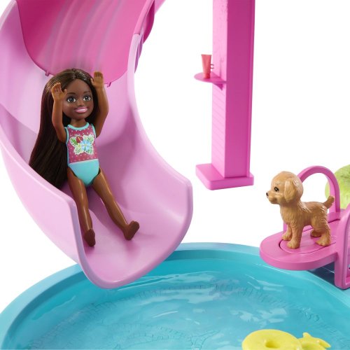 Vítejte u Barbie bazénu snů! Tady je každý den ten nejlepší na koupání! Herní set nabízí šest hracích zón, včetně bazénu, skluzavky, vířivky a snack baru, a více než 20 doplňků. Naplň bazén vodou a uspořádej pořádnou párty! Panenky Barbie (prodávají se samostatně) mohou klouzat po skluzavce do vody, páčkou spustíš bublinky ve vířivce a u snack baru naservíruješ další zábavu. Barvy a vzhled výrobku se mohou lišit.