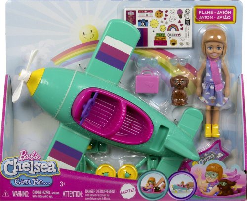 Fantazie může ožít s herním setem Chelsea™ a letadlo, který obsahuje panenku Chelsea™ a cestovního společníka, pejska. Více než osm příběhových doplňků pomáhá rozvinout hru, včetně kufříku a brýlí pro oba cestovatele. Barevné letadlo má pojízdná kola a točící se vrtuli, navíc místa pro panenku, štěňátko a kufr. Děti si mohou užít i kreativní zábavu při jeho zdobení pomocí přiloženého archu se samolepkami. Panenka neumí samostatně stát. Barvy a vzhled výrobku se mohou lišit.