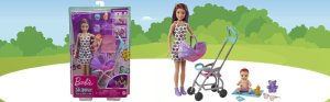 Zahrajte si hru na hlídání dětí s panenkou Skipper™, panenkou miminka a tematickými doplňky. Tento herní set obsahuje kočárek, který při tlačení poskakuje nahoru a dolů! Korbička se dá z podstavy kočárku odejmout pro pohodlné přenášení miminka. Realistickou hru inspirují doplňky včetně dětské dečky, chrastítka, lahvičky a medvídka. Panenka Skipper™ má na sobě letní šaty s kytičkami a fialové boty a miminko látkovou plenku. Panenka neumí samostatně stát. Barvy a vzhled výrobku se mohou lišit.