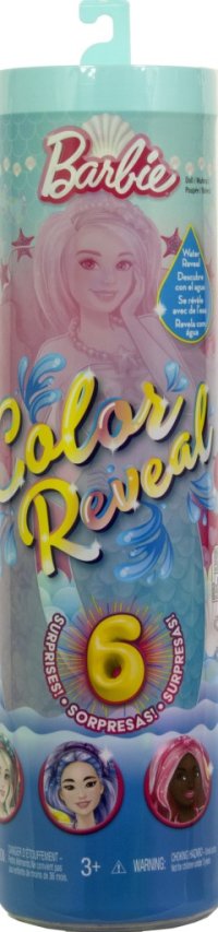 Panenky Barbie® Color Reveal™ mořská panna přinášejí zážitek z rozbalování plného překvapení (je jich hned šest)! Děti v této sérii mořských panen najdou jednu ze čtyř jedinečných panenek - každá má dlouhé vlasy s výrazným proužkem měnícím barvu. Odstraňte vnější vrstvu obalu, otevřete tubu a vytáhněte panenku Barbie®, která je pokrytá speciální vrstvou a nezapomeňte na sáčky s překvapením. Mezi doplňky najdete odnímatelnou ocasní ploutev, náhrdelník s mořskými přívěsky, čelenku a hřeben s mušlemi.