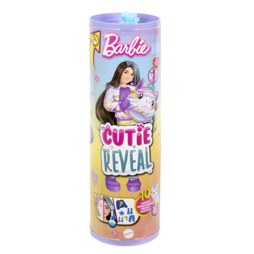 Panenky Barbie® Cutie Reveal™ barevné sny přináší ten nejlepší zážitek z rozbalování a 10 překvapení! Kterou panenku odhalíte? Ve hře je zajíček, zebra, tučňák nebo dalmatin - proměněný z černobílého do snového duhového kožíšku. Po sundání plyšového kostýmu odhalíte kloubovou panenku Barbie® s dlouhými barevnými vlasy. Postupně objevujte další překvapení, která můžete otevřít, například sukni nebo šortky, pár bot, náušnice, hřebínek ve tvaru hvězdy a odpovídající mini zvířátko. Otočením plyšového kostýmu získáte fleecovou bundičku a otočením hlavy kostýmu pelíšek pro zvířátko.
