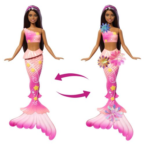 Zažijte zábavu s panenkou Barbie! Posunutím páčky na jejích zádech uvidíte, jak jí květiny kouzelně „rozkvétají“ od živůtku až po její ploutve, a to pořád dokola. Děti si s ní mohou hrát na souši i pod vodou, aby se jim na slunci nebo v moři naskytla nádherná přehlídka květů. S duhovými květy, ombré ploutvemi a doplňkem v podobě perlové čelenky v dlouhých hnědých vlasech s fialovým melírem - tato panenka Barbie mořská panna je naprosto okouzlující! Panenka nemůže stát ani plavat sama. Barvy a vzhled výrobku se mohou lišit.