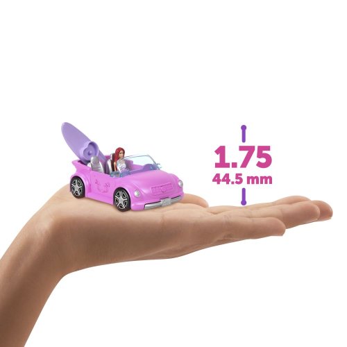Vstupte do světa panenky Barbie® s Mini BarbieLandem - místem, kde si můžete i s malou hračkou představovat velké věci! Tyto sety mini vozidel jsou připraveny ke hře nebo vystavení. Tato zmenšená verze plážového kabrioletu Barbie obsahuje surfovací prkno s možností změny barev a příslušenství pro scénu s vlnami a palmou. Sada se dodává s rozkošnou téměř 4 cm velkou panenkou Barbie, která se ohýbá v pase, takže může sedět a jet vstříc velkým dobrodružstvím v Mini BarbieLandu.