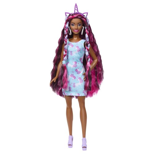 Kolekce Barbie® Panenka s fantastickými vlasy přináší úžasnou zábavu pro malé kadeřnice, které mohou vytvářet barevné kombinace účesů! Každá panenka má 21 cm dlouhé, barevné vlasy s duhovými odlesky. Děti si mohou vzhled své panenky přizpůsobit pomocí 10 módních a vlasových doplňků, včetně dalších šatů s potiskem, dalšího páru bot a kabelky! Stylingové doplňky zahrnují čelenku a sponku s barevnými pramínky vlasů, čelenku s drdoly, sponky a gumičky do vlasů. Jakmile děti dokončí svá mistrovská díla ve formě účesů, mohou pomocí kartáče vyčesat panence Barbie® její kadeře a užít si hodiny zábavy! Děti mohou snadno proměnit její vzhled pomocí kombinace módních doplňků a účesů - od vytváření účesů a copů, až po zdobení barevnými prvky, možnosti jsou nekonečné! Každá panenka se prodává samostatně v závislosti na dostupnosti. Panenky nemohou stát samostatně. Barvy a provedení se mohou lišit.