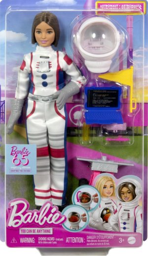 Oslavte 65. výročí panenky Barbie® s kolekcí panenek, které vyzdvihují nejoblíbenější povolání dětí. Panenka astronautka má na sobě speciální obleček a je dodávána s 10 tematickými doplňky, z nichž jeden má zábavnou pohyblivou funkci - štít helmy se otáčí, aby zrcadlil vesmír! Prodávají se samostatně dle aktuální nabídky. Panenka neumí samostatně stát. Barvy a vzhled výrobku se mohou lišit.