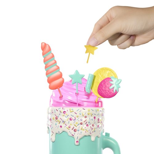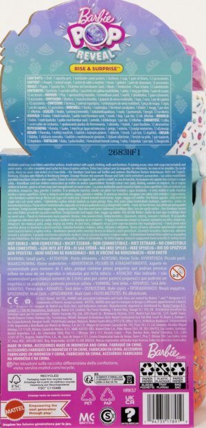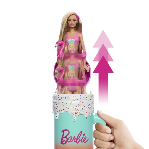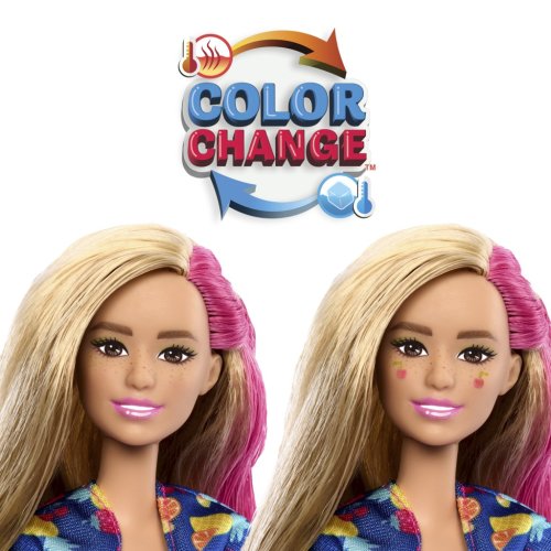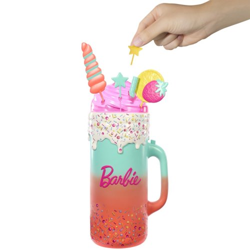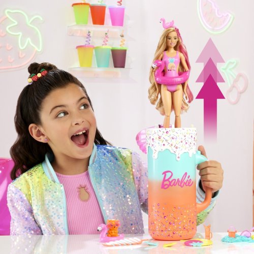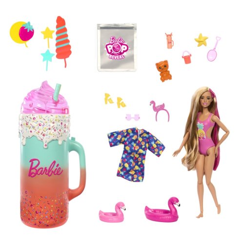 Dárkový set Barbie® Pop Reveal™ Deluxe šťavnaté ovoce překvapí panenkou a zábavnými módními doplňky a doplňky s ovocnou tematikou! Set obsahuje voňavou panenku, plyšové voňavé zvířátko, funkci změny barvy, tvarovatelný písek a více než 15 překvapení. Panenka neumí samostatně stát. Barvy a vzhled výrobku se mohou lišit.