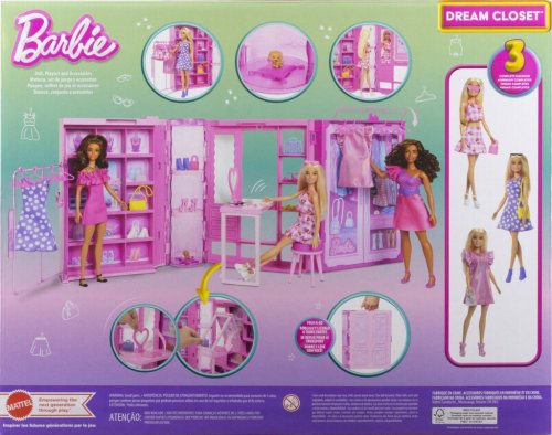 Barbie® Šatník snů v pastelových barvách s panenkou je vytvořený pro maximální zážitek ze hry s módou a přináší vychytávky ve formě rozkládání šatníku, má 2 stojany na oblečení, botník, kosmetický stolek, zrcadlo a koutek pro domácí mazlíčky. Součástí je také panenka Barbie® a 27 doplňků pro vyprávění příběhů, a to včetně štěňátka, měkkého kvalitního oblečení a barevných stylových doplňků! Panenka nemůže stát samostatně. Barvy a provedení se mohou lišit.