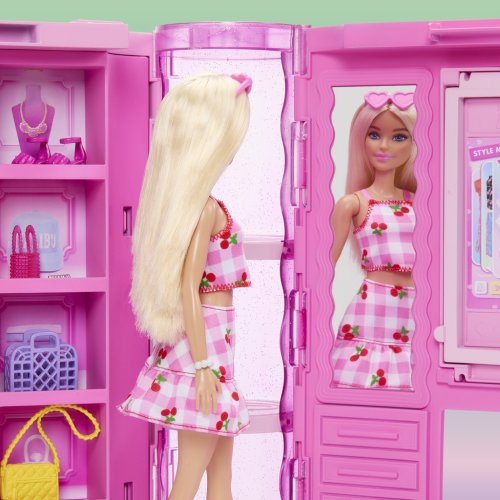 Barbie® Šatník snů v pastelových barvách s panenkou je vytvořený pro maximální zážitek ze hry s módou a přináší vychytávky ve formě rozkládání šatníku, má 2 stojany na oblečení, botník, kosmetický stolek, zrcadlo a koutek pro domácí mazlíčky.