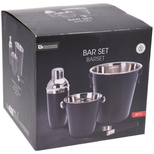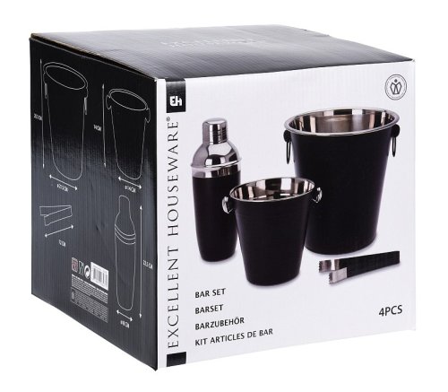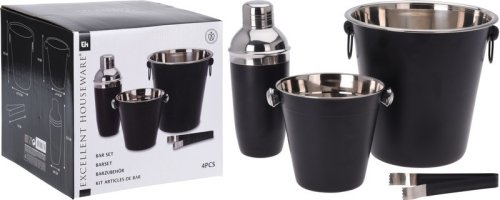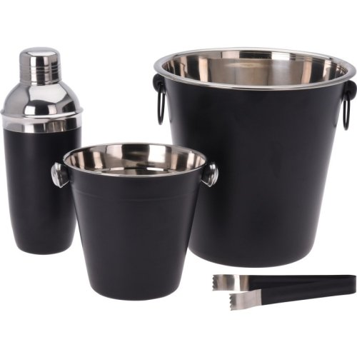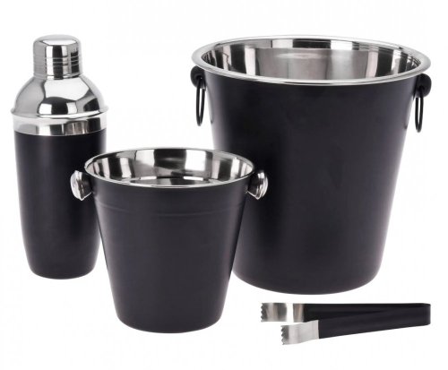 kompletní barmanský set v atraktivním černo/nerezovém provedení- materiál: nerezová ocel- matný černý povrch, nerezové vnitřní části- kvalitní provedení, dlouhá životnost- vhodné do myčky nádobí, pro zachování dlouhotrvajícího dokonalého vzhledu se však doporučuje ruční mytí- kompletní sada 4 ks obsahuje:- 1x shaker na koktejly s víčkem a sítkem: objem 0.5 l / výška 22.5 cm- 1x kyblík na led: horní průměr 14 x výška 14 cm- 1x kyblík na víno, sekt či šampaňské: horní průměr 20 x výška 21.5 cm- 1x kleště na led 12 cm