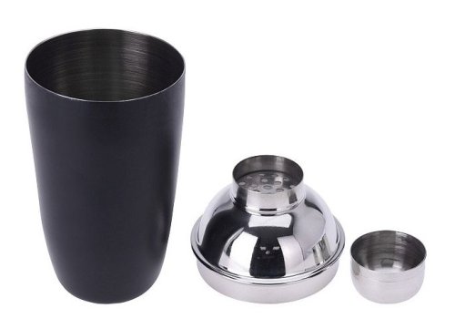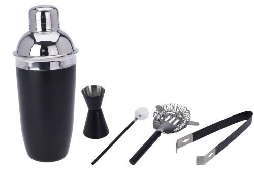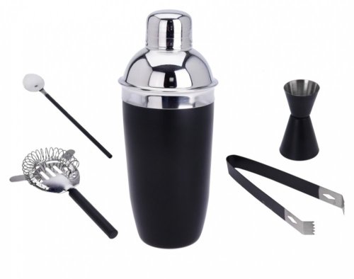 kompletní barmanský set v atraktivním černo/nerezovém provedení- materiál: nerezová ocel- matný černý povrch, nerezové vnitřní části- kvalitní provedení, dlouhá životnost- vhodné do myčky nádobí, pro zachování dlouhotrvajícího dokonalého vzhledu se však doporučuje ruční mytí- kompletní sada 5 ks obsahuje:- 1x shaker na koktejly s víčkem: objem 0.5 l / výška 20.5 cm- 1x sítko pro cezení přímo ze shakeru - 1x míchací lžíce 20 cm- 1x oboustranná odměrka 9 x 5 cm- 1x kleště na led či ovoce 12 cm