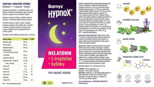 Složení (1 kapsle 0,85 g): plnidlo (hydroxypropylmethylcelulosa, maltodextrin), extrakt květů mučenky pletní (Passiflora incarnata, 4:1) 100 mg, extrakt šištic chmele otáčivého (Humulus lupulus, 4:1) 100 mg, extrakt květů meduňky lékařské (Melissa officinalis, 5:1) 100 mg, extrakt kořenu kozlíku lékařského (Valeriana officinalis, 15:1, ≥ 0,8 % kyseliny valerové) 100 mg, L-tryptofan 100 mg, extrakt natě levandule úzkolisté (Lavandula angustifolia, 4:1) 40 mg, protispékavá látka (stearan hořečnatý), L-theanin (extrakt listů zeleného čaje Camellia sinensis, 25:1) 5 mg, niacin (vitamin B3, nikotinamid, 25 % RHP*) 4 mg, thiamin (vitamin B1, thiamin-hydrochlorid, 91 % RHP*) 1 mg, riboflavin (vitamin B2, 50 % RHP*) 0,7 mg, vitamin B6 (pyridoxin-hydrochlorid, 50 % RHP*) 0,7 mg, melatonin 0,49 mg, vitamin B12 (kyanokobalamin, 50 % RHP*) 1,25 µg.