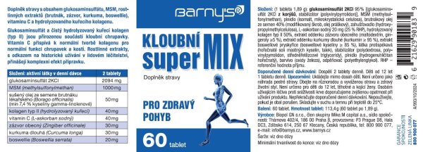 Složení: (1 tableta 1,89 g): glukosaminsulfát 2KCl 95% [(glukosaminsulfát 2KCl z korýšů, stabilizátor (polyvinylpyrrolidon)], MSM (methylsulfonylmethan), sladidlo (isomalt), plnidlo (mikrokrystalická celulosa), brutnákový olej ze semen 40% (modifikovaný škrob, olej práškový), zahušťovadlo (hydroxypropylmethylcelulosa), L-askorban sodný 20 mg (25 % RHP*), hydrolyzovaný kolagen typ II 50%, extrakt oddenku zázvoru obecného (maltodextrin, gingeroly ≥5 %), extrakt oddenku kurkumy dlouhé (kurkumin ≥ 95 %), extrakt boswellové pryskyřice (boswellové kyseliny ≥ 85 %), látka protispékavá (hořečnaté soli mastných kyselin, talek), stabilizátor (polydextrosa, polyvinylpyrrolidon), plnidlo (hydrogenuhličitan hořečnatý), barvivo (oxidy železa), středněřetězcové triglyceridy, odpěňovač (polyethylenglykol).