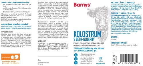 Nejvýznamnější součástí kolostra jsou imunoglobuliny. Bovinní – kravské kolostrum obsahuje mnohonásobně více imunoglobulinu IgG než kolostrum lidské. Barny's Kolostrum s beta-glukany je obohaceno o vysoce čištěné koncentrované beta-glukany a vitamin C, selen, zinek pro podporu normální funkce imunitního systému.