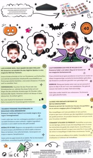 ideální na oslavy, karnevaly, halloween nebo pálení čarodějnic jednoduchá aplikace - štětcem nebo houbičkou vhodné pro obličej i tělo dlouhotrvající, jasné a syté barvy k namalování nejméně 40 plnobarevných obličejů bezpečné a netoxické, vhodné i pro citlivou kůži lehce odstranitelné - omyvatelné vodou a mýdlem obsahuje 8 barev, houbičky, štětec a obrázkový návod