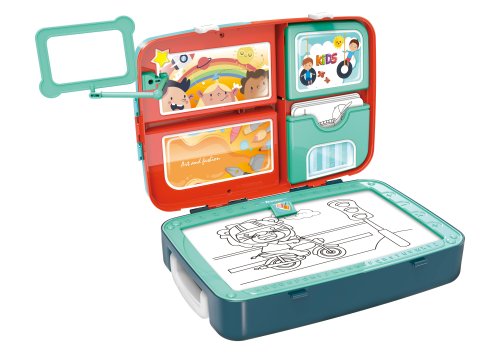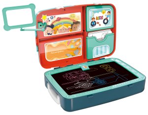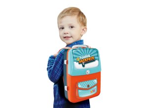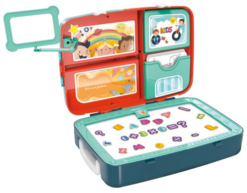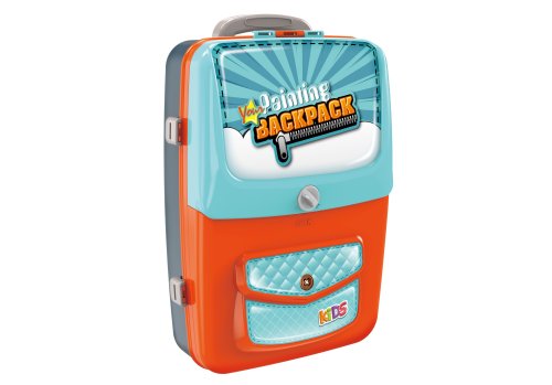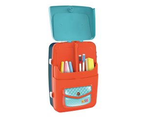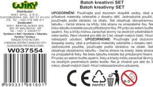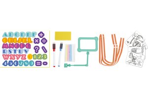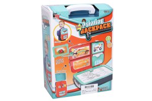 Batoh kreativní. Velikost 28cm. Otevírací batoh, obsahuje otevíratelné přihrádky, kreslicí tabulku na mazací fixy a přichycení magnetek, druhou strana tabulky lze popsat křídou, magnetická čísla a písmenka, křídy, hubku na mazání, mazací fixy, popruhy na záda, nálepky na ozdobení batohu.