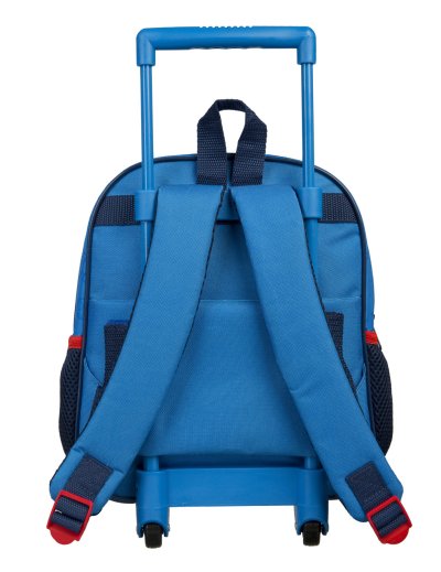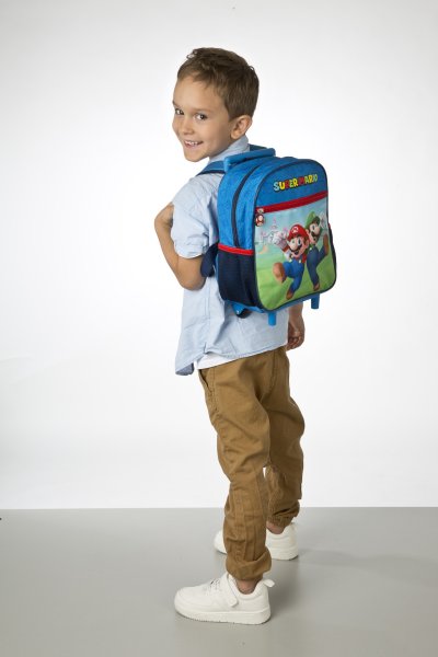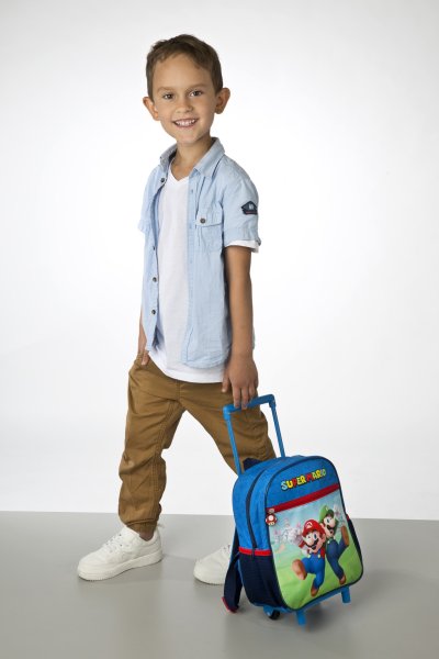 Batůžek s kolečky a madlem Super Mario s pevnými zády, na zip s bočními kapsami na pití a nastavitelnými popruhy. Materiál Polyester.