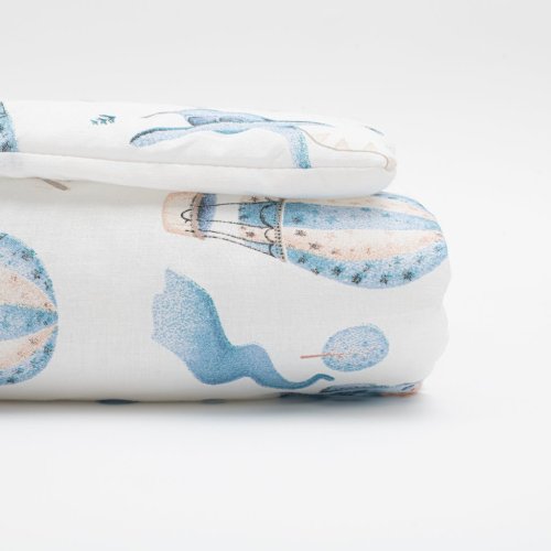Nádherný bavlněný set do kočárku New Baby Romance. Set obsahuje polštářek a peřinku s potiskem pohádkového dobrodružství v oblacích. Vše je vyplněno antialergickým vláknem. Set je ušitý z vysoce kvalitní bavlny. Bavlněný set luxusně a jemně pohladí a zahřeje pokožku vašeho miminka. Rozměry: polštář: cca 32x25 cm, peřinka: cca 82x68 cm. Složení: povlak 100% bavlna, výplň 100% polyester.<BR>Tyto výrobky jsou bezpečné, protože:<BR>- přírodní bavlna nezpůsobuje odřeniny a podráždění, jelikož neobsahuje formaldehydy a další prvky, které kojencům škodí<BR>- neztrácí barvu a nezabarvuje oblečení<BR>- nabízené vzory jsou příjemné na pohled a mají uklidňující barvy<BR>- materiál, který je používán pro výplně polštářů a přikrývek, je 100% protialergický, což znamená, že se v jeho vláknech nešíří žádné mikroorganismy ani plíseň