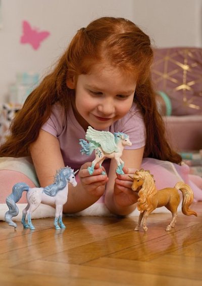 Hrdý hřebec jednorožce Apollo představuje udržitelnou solární energii. Není divu, protože se svou zlatohnědou srstí a zlatým zoubkovaným hřebenem na krku září jako slunce. Netrpělivě švihá svým bujným kudrnatým ocasem sem a tam a klape kopýtky: Kde jsou klisna jednorožce Flowy a hříbě jednorožce Stormy? Chtěli společně vyrazit na rodinný výlet a prozkoumat krásný svět BAYALA®. Ale možná mu bude dělat společnost někdo jiný? Rozměry balení: 11,8 x 16,4 x 3,9 cm. Věk: 5+