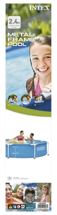 Bazénový set o velikosti 2,44 m x 51 cm, Objem vody (90% výšky bazénové stěny) je 1828 litrů. Bazén je naplněn do 30 minut.