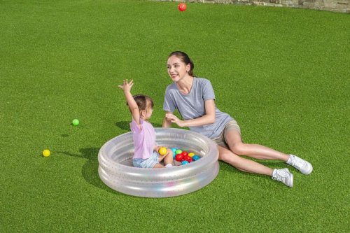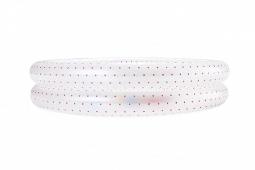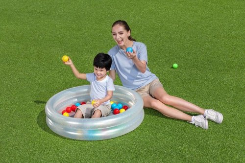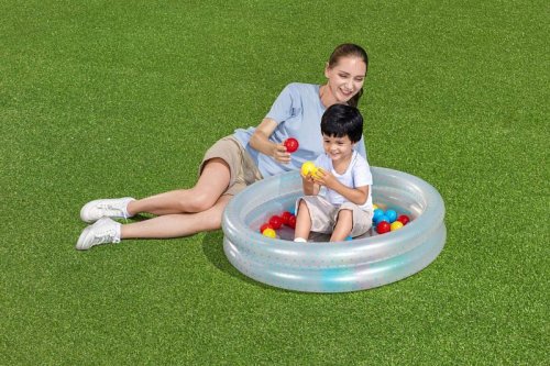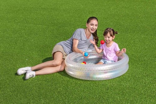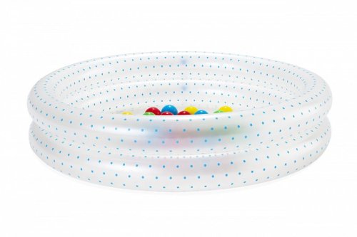 Dětský bazén s míčky. Dva nafukovací kruhy zajišťují dětem měkkou podporu. Hru s 50 vícebarevnými hracími míčky si děti zamilují. Když je hezké počasí, naplňte bazének vodou a užijte si vodní hrátky. Bazének se snadno nafoukne, vyfoukne a složí. 2 barevné provedení (světle růžové a světle modré puntíky). Obsahuje: 1 nafukovací bazének, 50 barevných míčků, 1 opravnou záplatu. Rozměr bazénku: 91 x 20 cm. Věk: 2+. Používejte pouze pod dohledem dospělé osoby.