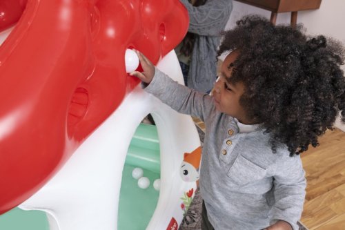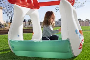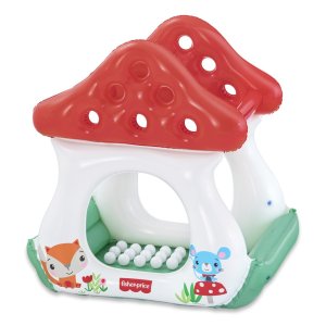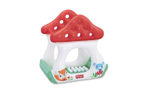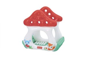 Bazének nafukovací s míčky Muchomůrka od značky Fisher Price je určený pro děti od dvou let a nabízí zábavné i bezpečné prostředí pro aktivní hru. Tento nafukovací bazén má tvar pohádkové muchomůrky s výraznou červenou střechou a bílými stěnami, doplněnými o barevné ilustrace lesních zvířátek, jako jsou myška a liška. Spodní část bazénu je zelená, což vytváří příjemný a hravý kontrast barev. Bazének je vyroben z odolného PVC, které je díky své pevnosti a kvalitnímu provedení odolné vůči mechanickému poškození a zajišťuje stabilitu celé konstrukce.