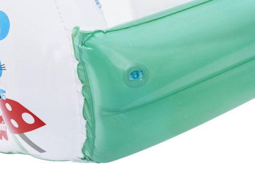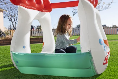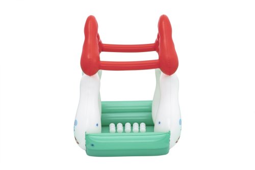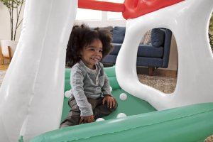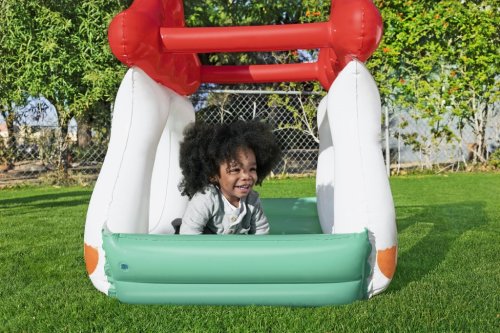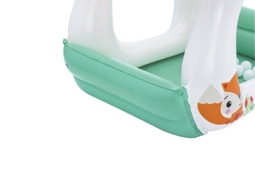 Bazén má nafukovací měkké stěny a širokou základnu, která zabraňuje jeho převrácení, čímž zvyšuje bezpečnost dítěte při hraní. Konstrukce je otevřená ze všech stran, což umožňuje snadný přístup dovnitř a zároveň nabízí dostatek prostoru pro pohyb. Horní část tvoří dvě nafukovací červené střechy s otvory, které mohou sloužit jako herní prvek, například pro vkládání přiložených míčků. Uvnitř bazénku se nachází 15 bílých plastových míčků, které rozvíjejí motoriku a smyslové vnímání dítěte. Bazének je navíc vybaven opravnou záplatou pro případné menší poškození.