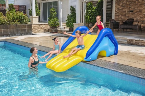 Jednoduše jej položte na okraj vašeho bazénu a připojte vodní hadici, abyste aktivovali vestavěné postřikovače a naplnili 4 vodní komory, aby byla skluzavka stabilní. Nosnost 69 kg. Rozměry skluzavky jsou 247 × 124 × 100 cm a součástí balení je opravná záplata.